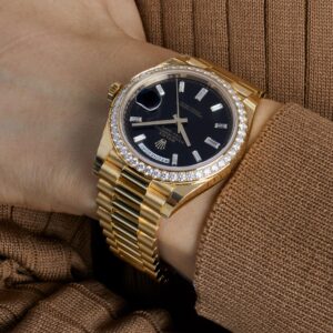 Rolex Day-Date 228348RBR Yellow Gold Black Diamond Dial Diamond Bezel