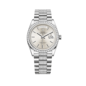 Rolex Day-Date 128349RBR White Gold Diamond Bezel Silver Dial