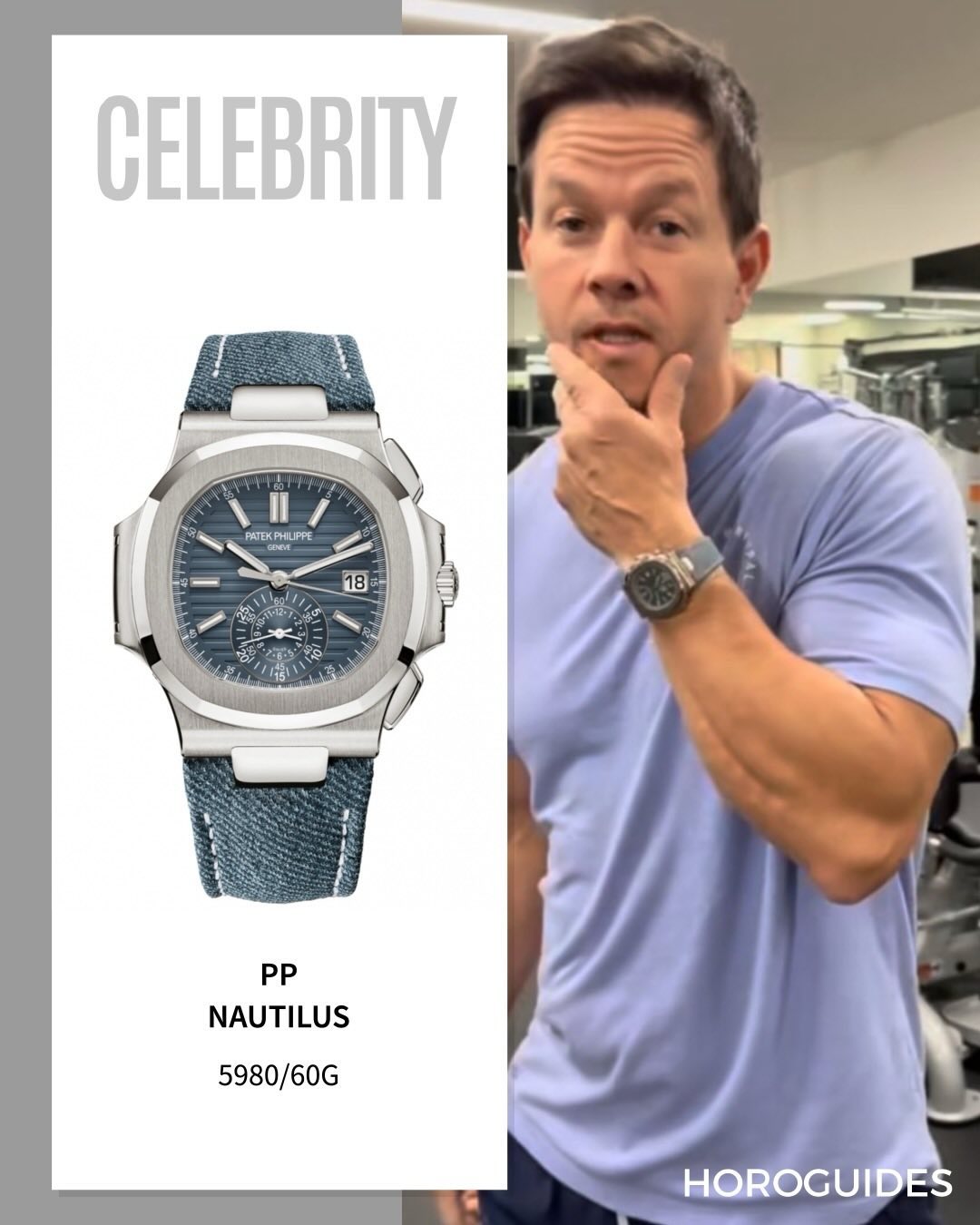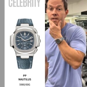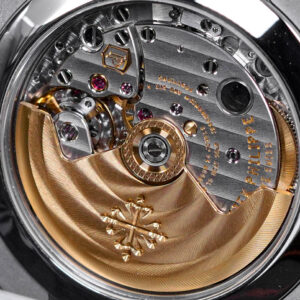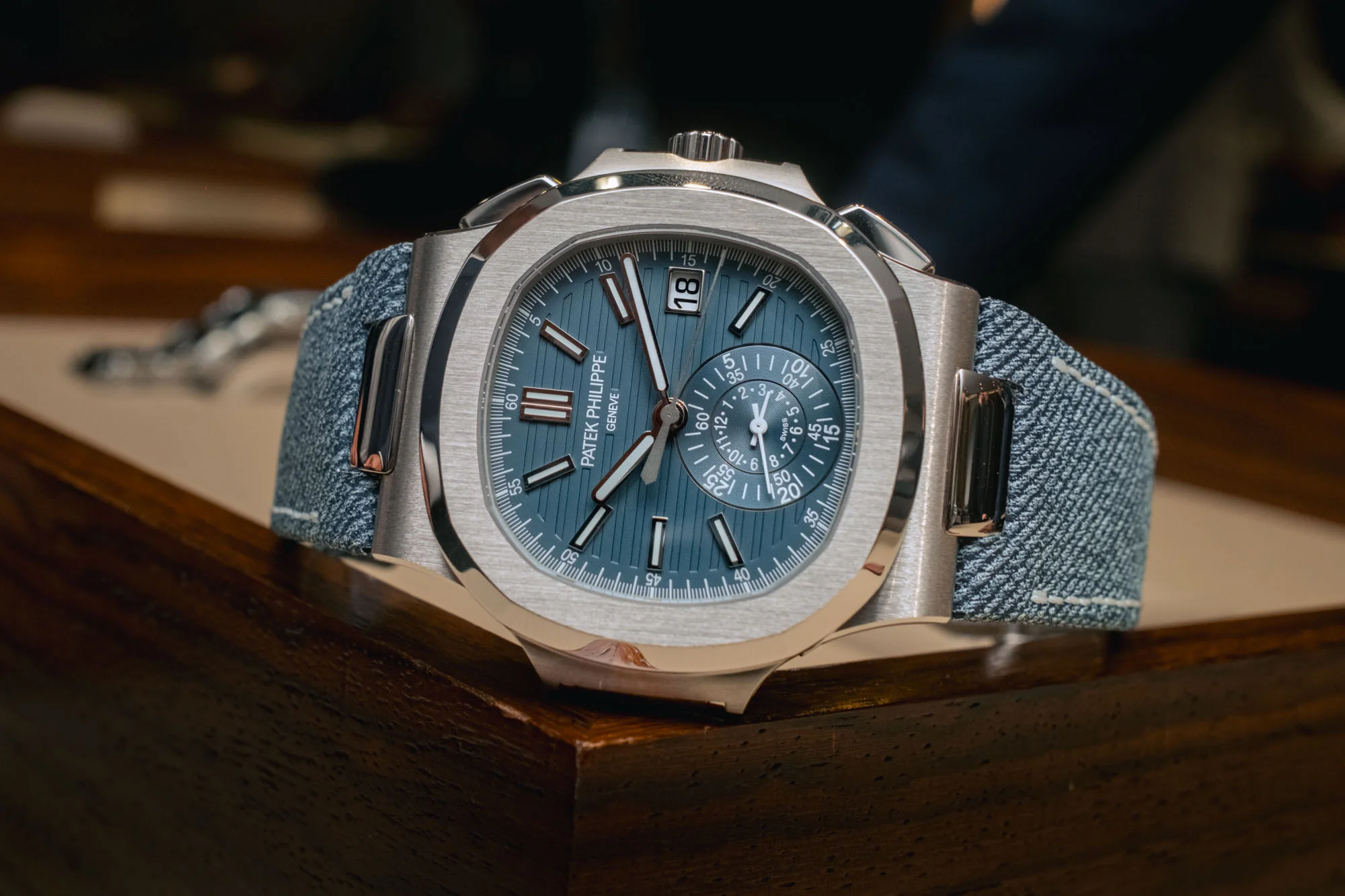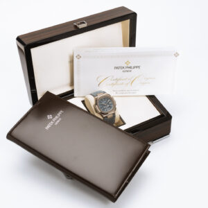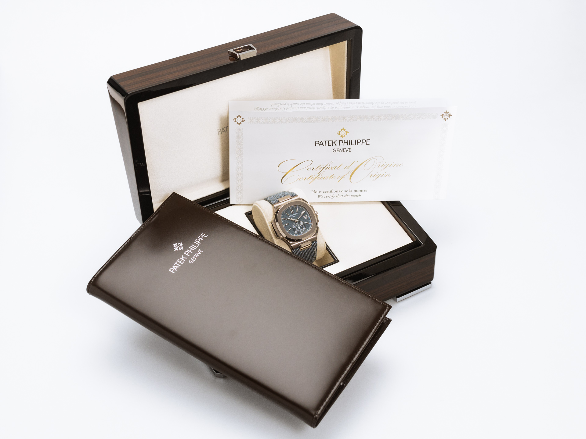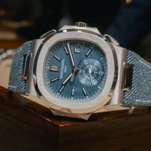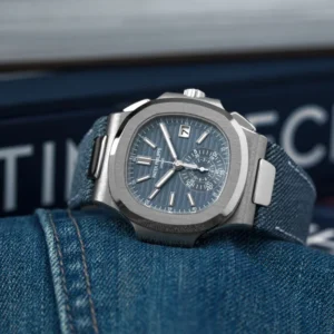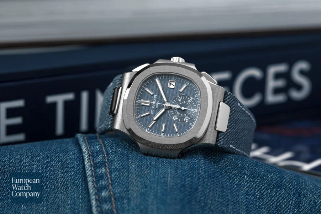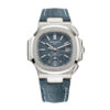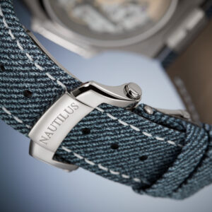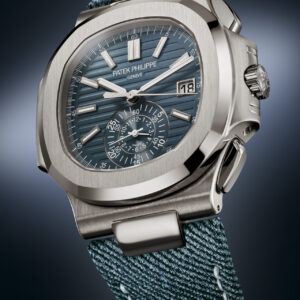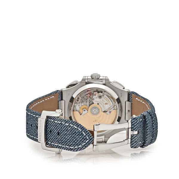 The Nautilus self-winding flyback chronograph comes in a new white gold version with an opaline blue-gray dial. This refined shade is echoed on the blue-gray denim-patterned calfskin strap with white gold Nautilus fold-over clasp. The watch is also delivered with an additional blue-gray composite material strap with fabric pattern.