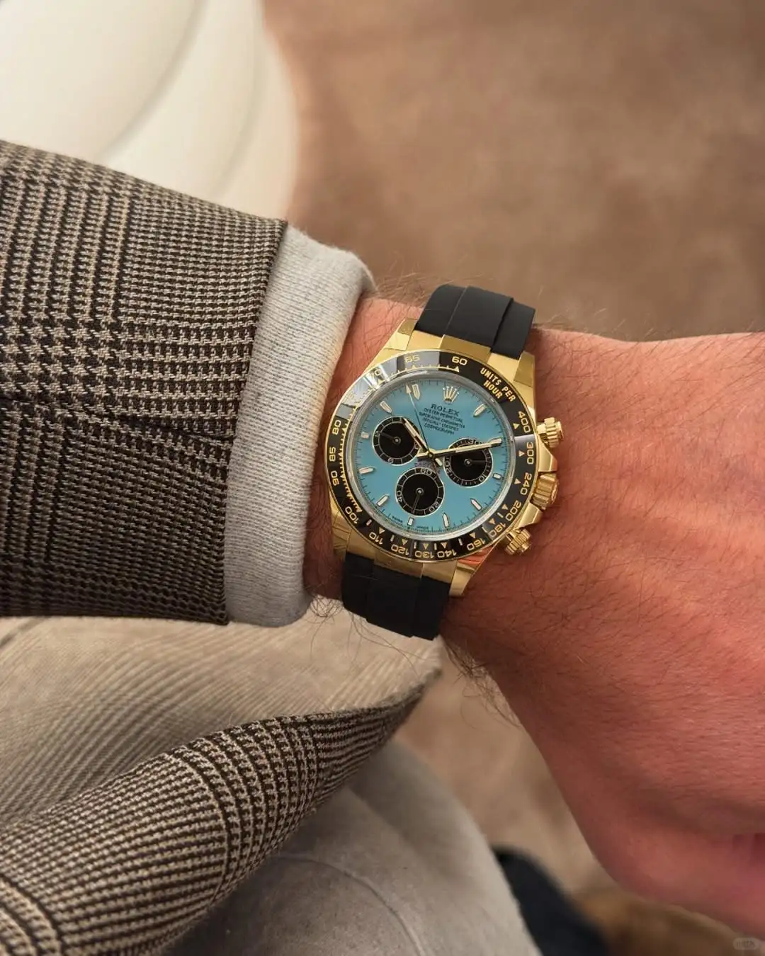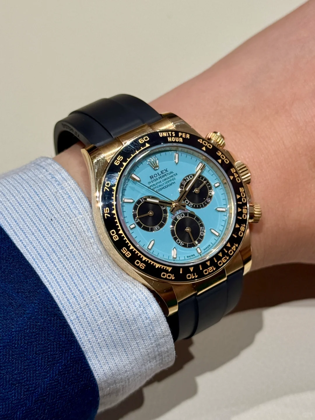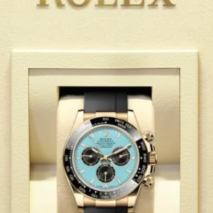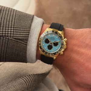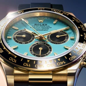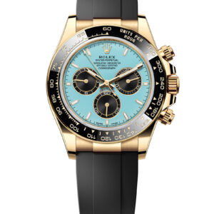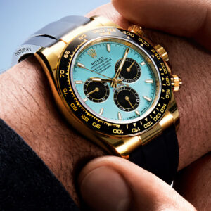 This year, Rolex is releasing a Daytona with a bright turquoise dial. Notably, this isn’t the “ice blue” dial that the Crown often pairs with platinum pieces and is relatively common in the brand’s catalog. Instead, this is a vivid blue reminiscent of the one associated with a certain famous jeweler. The color isn’t entirely new to the Rolex catalog, however. In 2020, the Crown put out an Oyster Perpetual with the Tiffany-esque hue that quickly became a collector favorite. This year, Tudor, Rolex’s sister brand, put out a version of its Black Bay Chrono in a very similar tone that it called “Flamingo Blue”. For what it’s worth, Rolex is describing this dial as “a resplendent turquoise blue lacquer dial.”