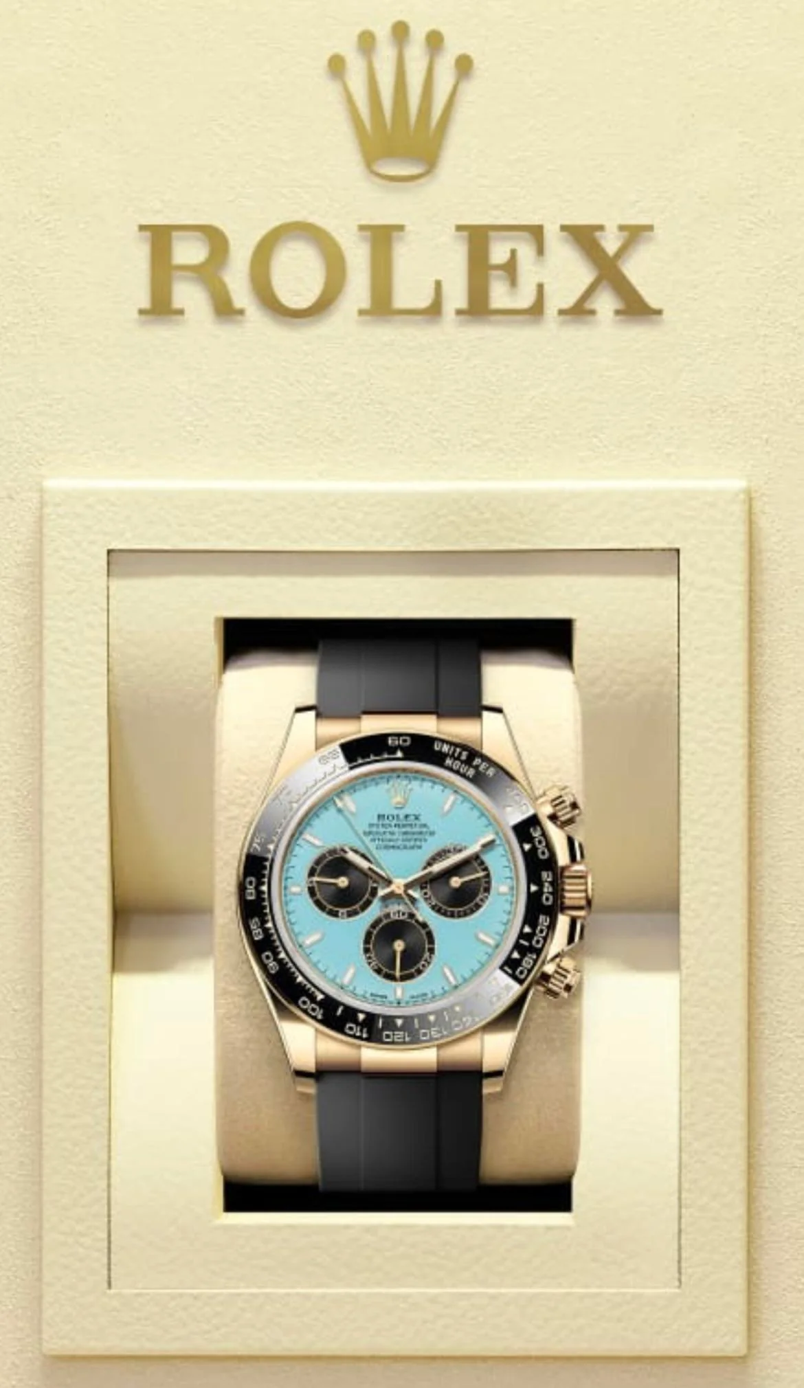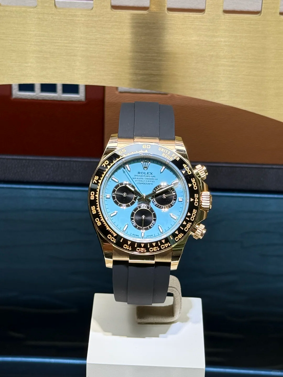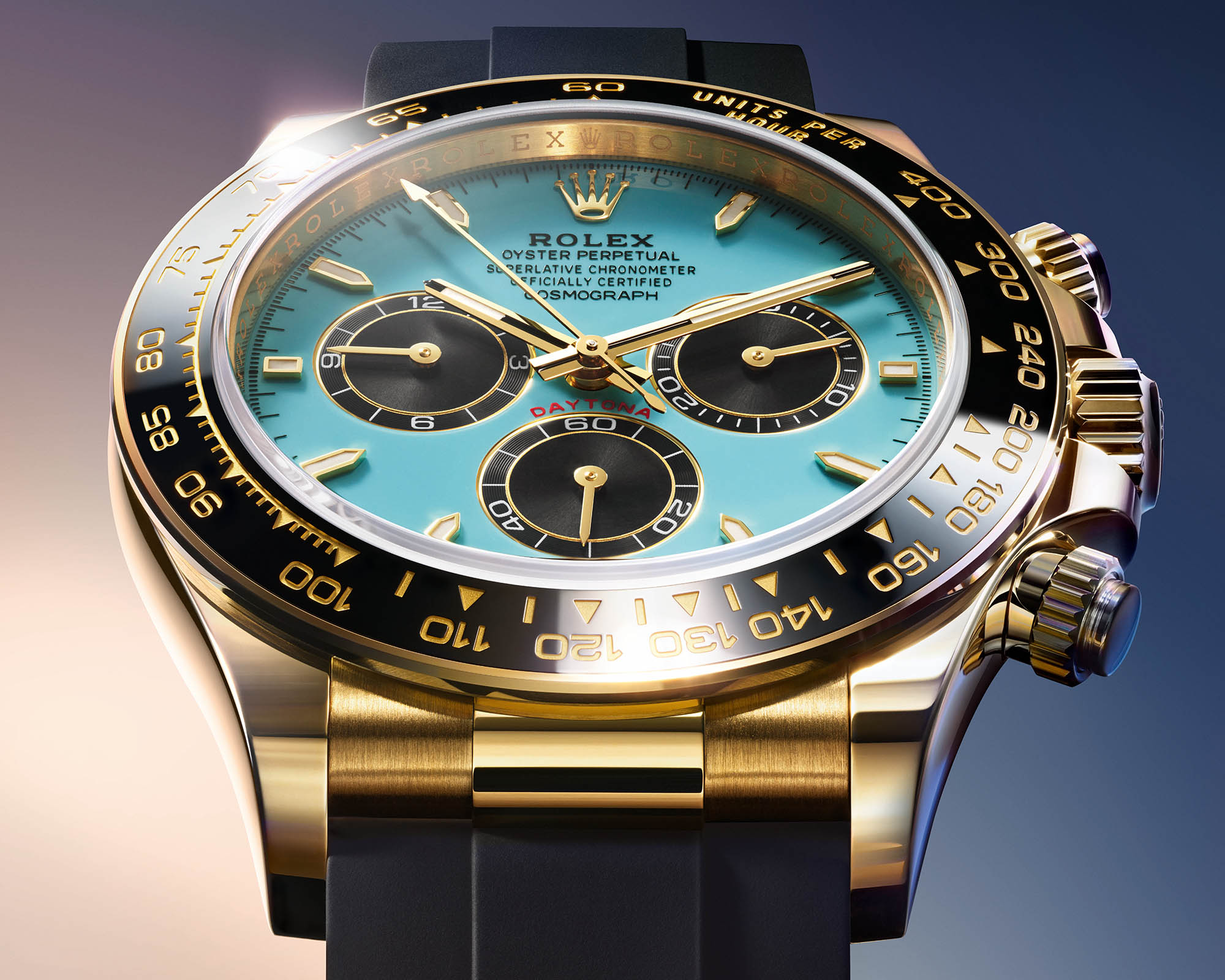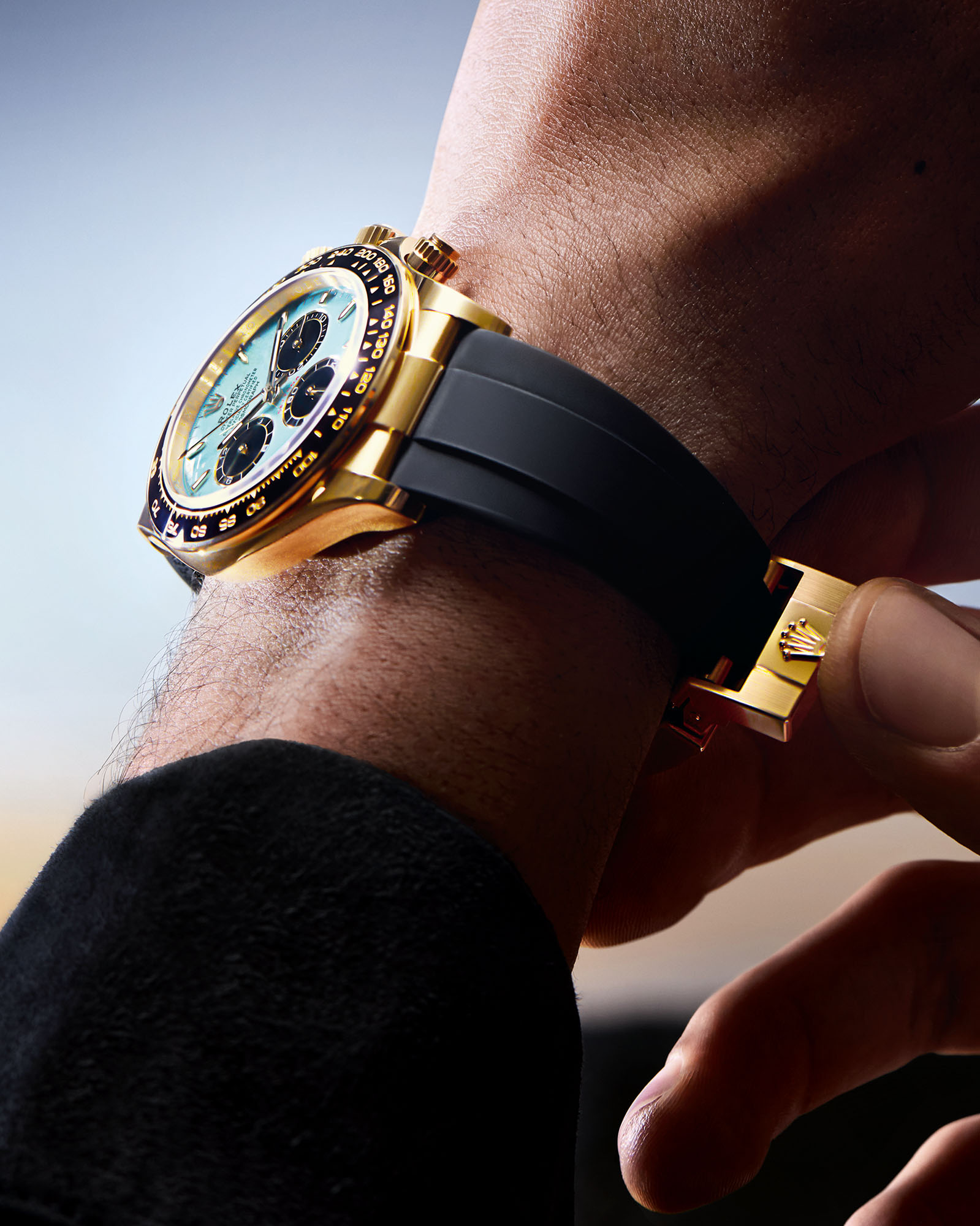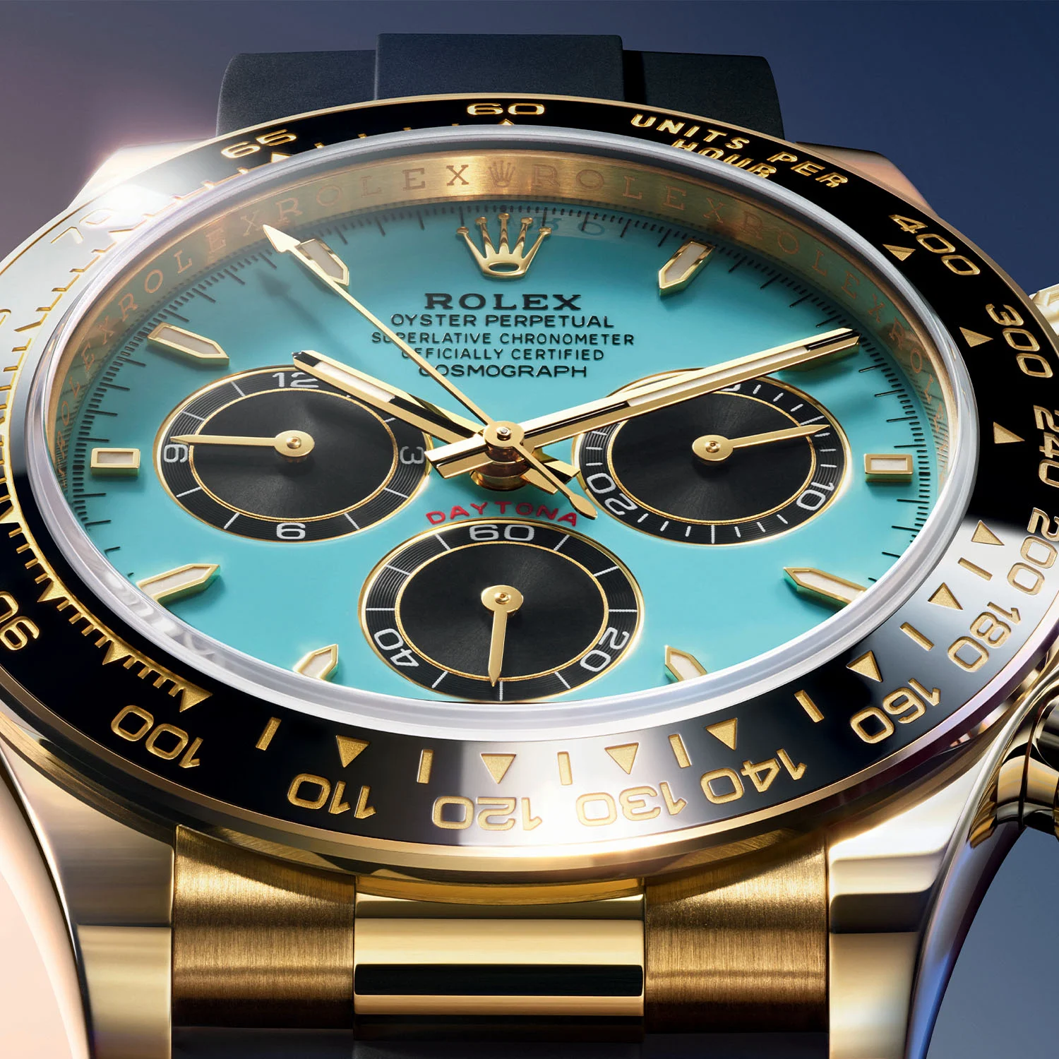 The new reference retains the signature specs of the yellow gold Daytona, starting by a 40mm case fitted with a black Cerachrom monobloc bezel with tachymetric scale. Water resistant to 100m, it has a screw-down crown and screwed pushers. The novelty lies in its striking new dial and the new, bold combination of colours and materials. The brand describes it as a turquoise and black lacquer dial but Tiffany blue immediately came to our minds when discovering the press pictures. It fearures black, snailed counters, 18k gold applique hour markers and hands with a Chromalight display.