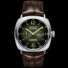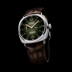 Green sun-brushed with luminous Arabic numerals and hour markers. Month, Day of the week, date at 3 o’clock and small seconds at 9 o’clock