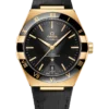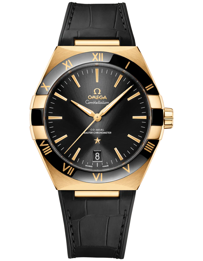 This 41 mm 18K yellow gold model features a polished black ceramic bezel with Roman numerals in Ceragold™, a sun-brushed black dial and a date window at the 6 o’clock position. The hands, OMEGA logo, Constellation star and facetted indexes are all in 18K yellow gold.
