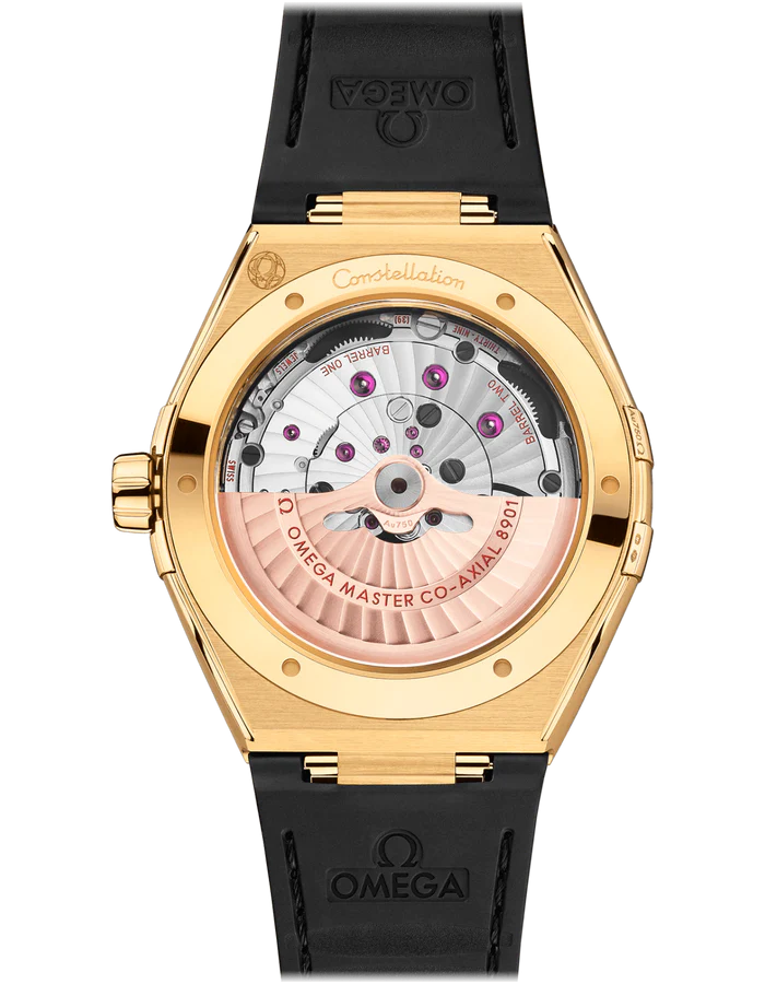 Presented on a black leather strap with rubber lining, this timepiece is driven by the OMEGA Co-Axial Master Chronometer Calibre 8901, visible through the domed scratch-resistant sapphire crystal.