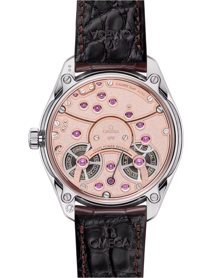 OMEGA’s first manual-winding central tourbillon movement, with Co Axial escapement, black ceramised titanium tourbillon cage and base, hand polished bevels on cage, bridges and mechanisms, 18K Sedna™ gold bridges and main plate. Titanium tourbillon cage rotates completely once every minute. 3 days power reserve indicator. Magnetic resistance of 15,000 gauss allows the timepiece to be certified at the industry’s highest level.