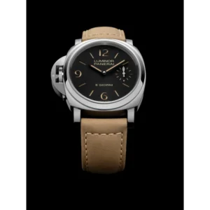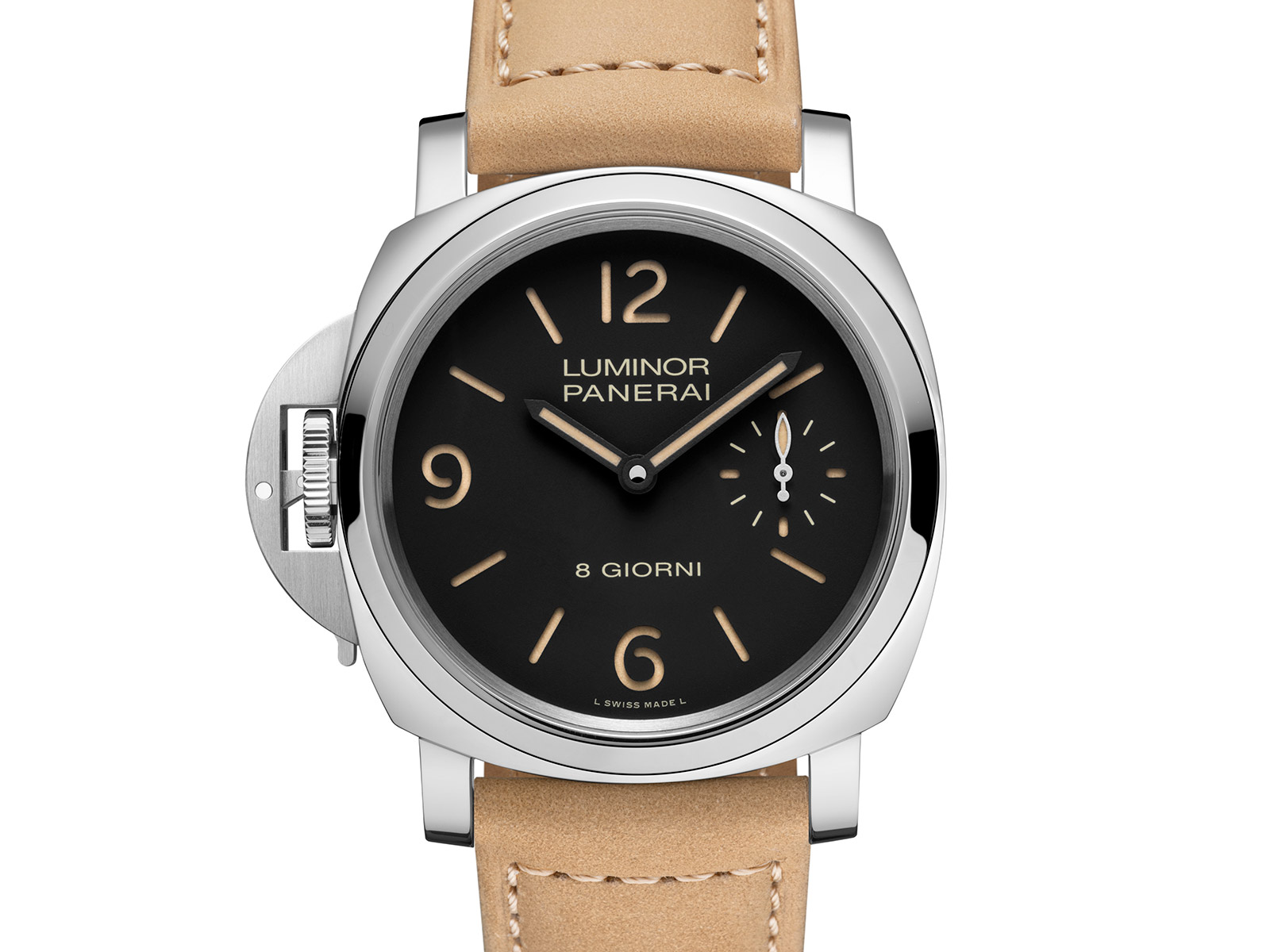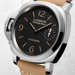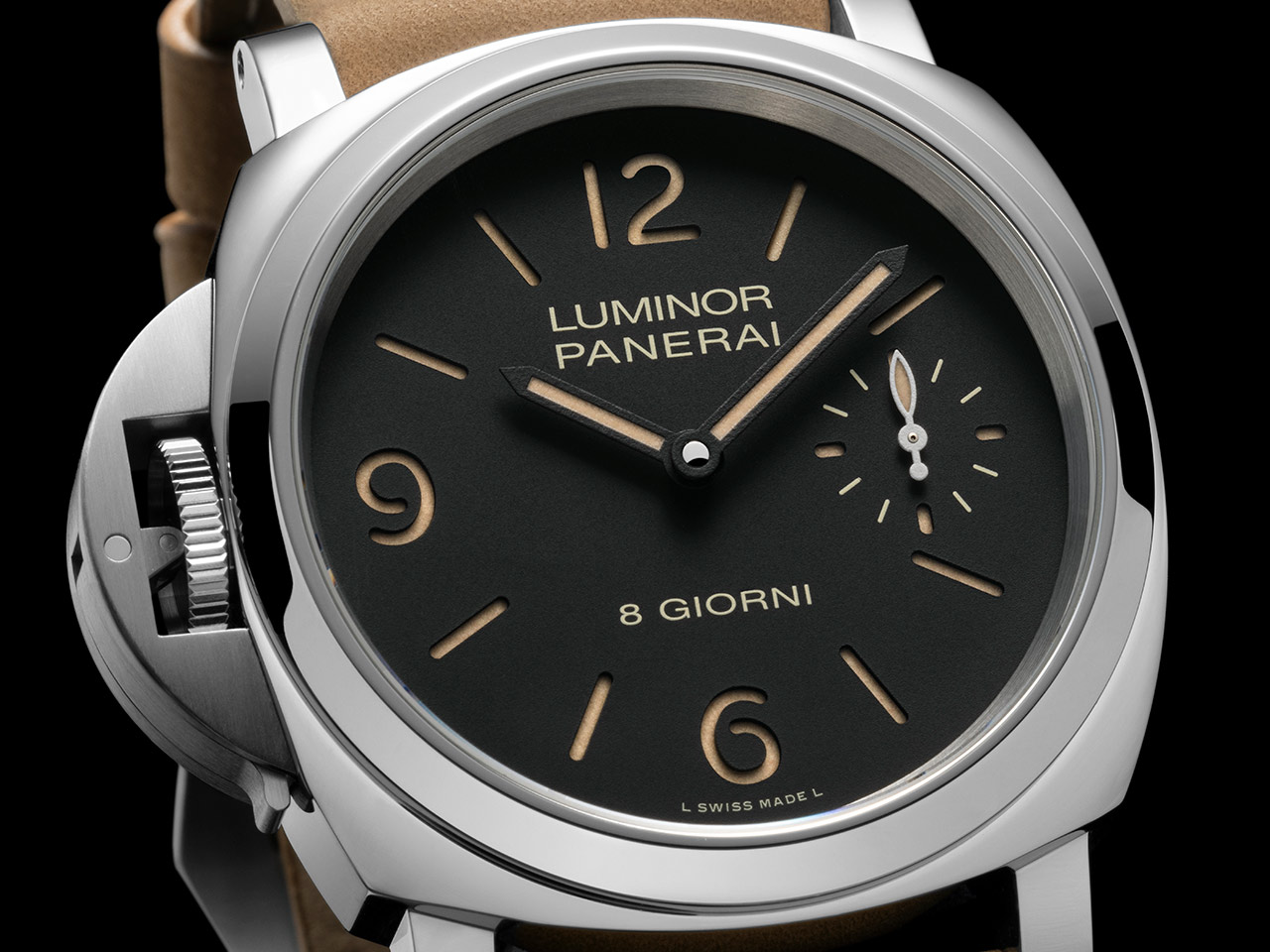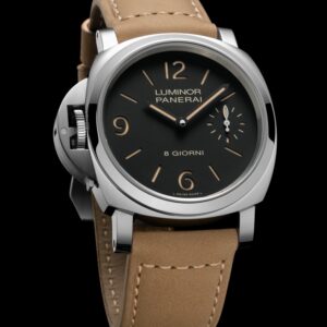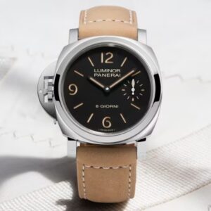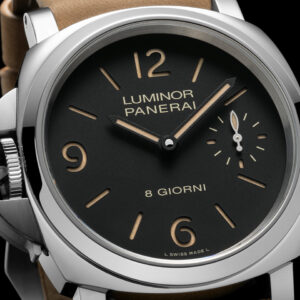 Black with luminous Arabic numerals and hour markers. Small seconds at 3 o’clock