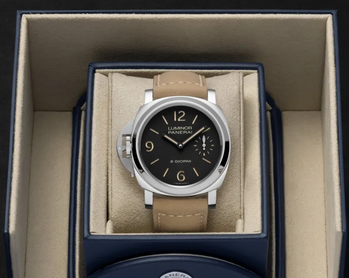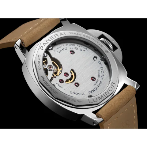 Hand-wound mechanical, P.5000 calibre, 15 ½ lignes, 4.5 mm thick, 21 jewels, Glucydur® balance, 21,600 alternations/hour. Incabloc Parechoc® anti-shock device. Power reserve 8 days, two barrels. 146 components
