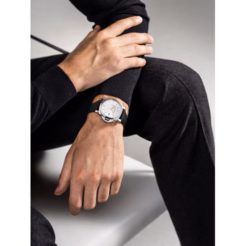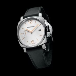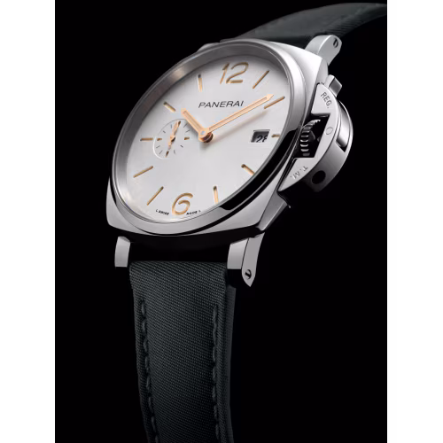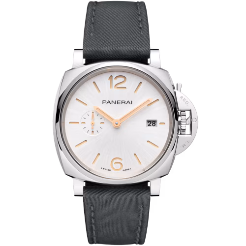 White sun-brushed with luminous Arabic numerals and hour markers. Date at 3 o’clock and small seconds at 9 o’clock