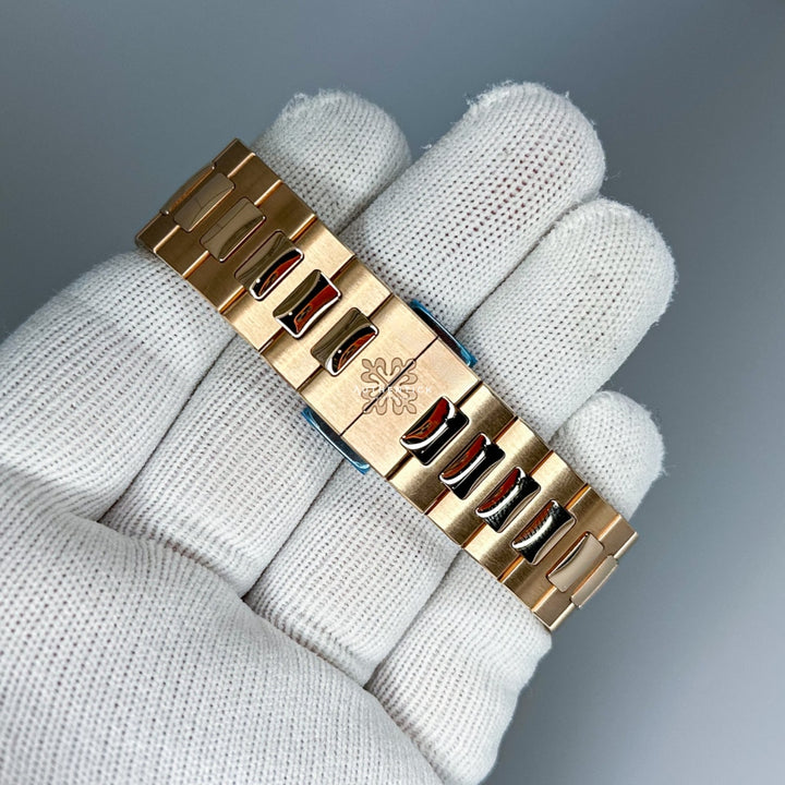 The famous Ref. 5712/1R-001 Nautilus with an analog date, moon phases, and a power-reserve indicator presents sporty appeal and elegance; it features a case and bracelet in rose gold with a brown sunburst dial and a black gradation.