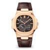 Patek Philippe Nautilus Watches. 40mm 18K rose gold case, sapphire crystal back, screw-down crown, black-brown dial with gold applied hour markers with luminescent coating, self-winding caliber 240 PS IRM C LU movement with power reserve, date by hand, moon phases, seconds subdial, approximately 48 hour of power reserve, leather strap with fold-over buckle. Water resistant to 120 meters.
