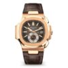 40.5mm 18K rose gold case, sapphire crystal back, screw-down crown, black-brown dial with gold applied hour markers with luminescent coating, self winding caliber CH 28-520 C movement with 60-minute and 12-hour monocounter chronograph and date, approximately 55 hour of power reserve, matt dark brown alligator strap with Nautilus fold-over buckle.