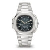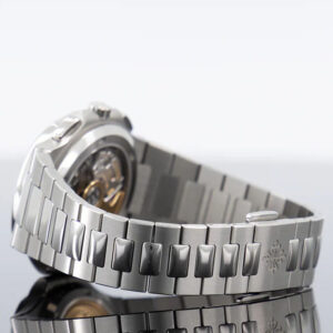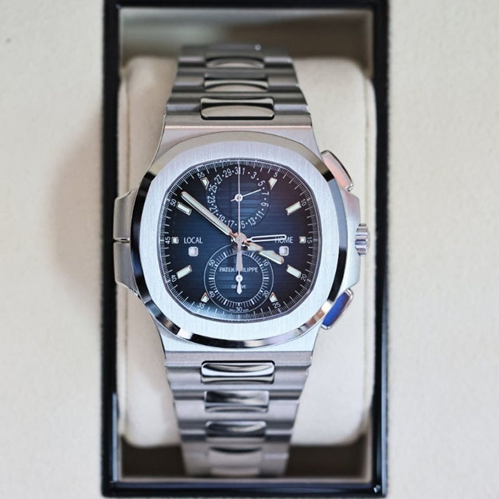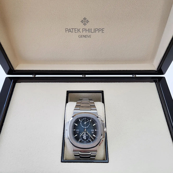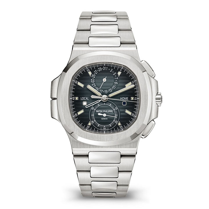 The Ref. 5990/1A-011 Nautilus Travel Time chronograph is one of Patek Philippe’s rare steel watches. It features a new blue dial with a ray sunburst dial and a delicate black gradation to the periphery.