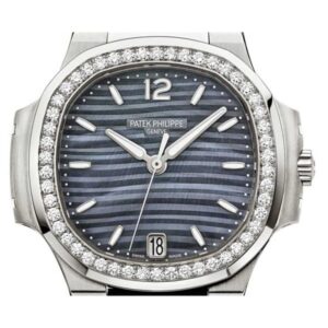 Patek Philippe Nautilus Blue Tinted Mother Of Pearl Dial Automatic Ladies Diamond Watch 7018/1A-010. Stainless steel case with a stainless steel bracelet. Fixed bezel. Blue tinted mother of pearl dial with silver-tone hands and index- Arabic at the 12 o’ clock hour markers. Dial Type: Analog. Luminescent hands and markers. Date display at the 6 o’clock position. Automatic movement. Caliber 324 s c engine. Scratch resistant sapphire crystal. Skeleton transparent exhibition see through case back. Case diameter: 33.6 mm. Cushion case shape. Fold over with safety clasp. Water resistant at 60 meters / 200 feet. Functions: date, hour, minute, second. Additional Info: bezel set with 50 diamonds (~0.71 ct). Luxury watch style.