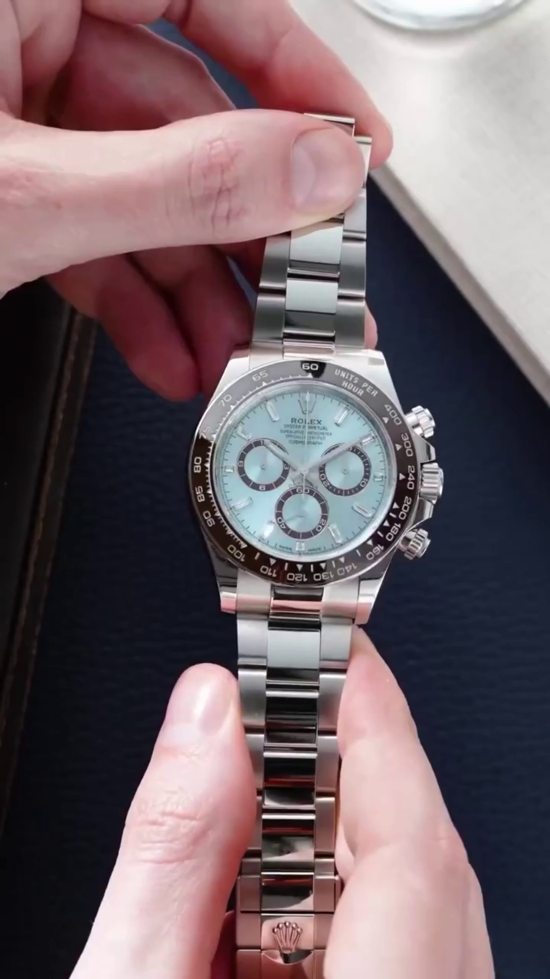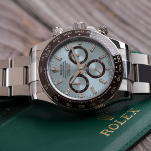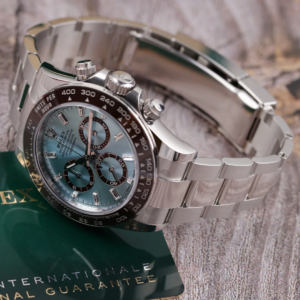 The Oyster Perpetual Cosmograph Daytona in platinum with an ice-blue dial and contrasting counters.