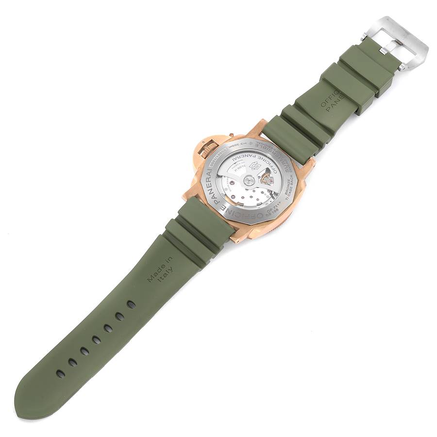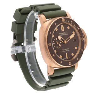 Panerai Luminor Submersible 47mm Bronze Mens Watch PAM00968 Box Papers. Automatic self-winding movement. Two part cushion shaped bronze case 47.0 mm in diameter with titanium case back. Panerai patented crown protector. Unidirectional rotating bronze bezel with brown insert and graduated scale. Scratch resistant sapphire crystal. Brown dial with luminous baton hands and dot hour markers. Date window at 3. Small seconds subdial at 9. Green rubber strap with titanium tang buckle.