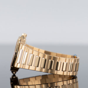 A rose gold bracelet completes the refined look of this 35-millimeter ladies’ watch.