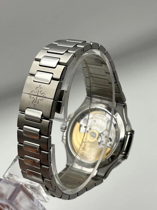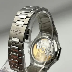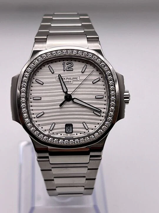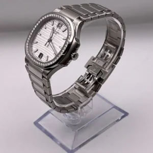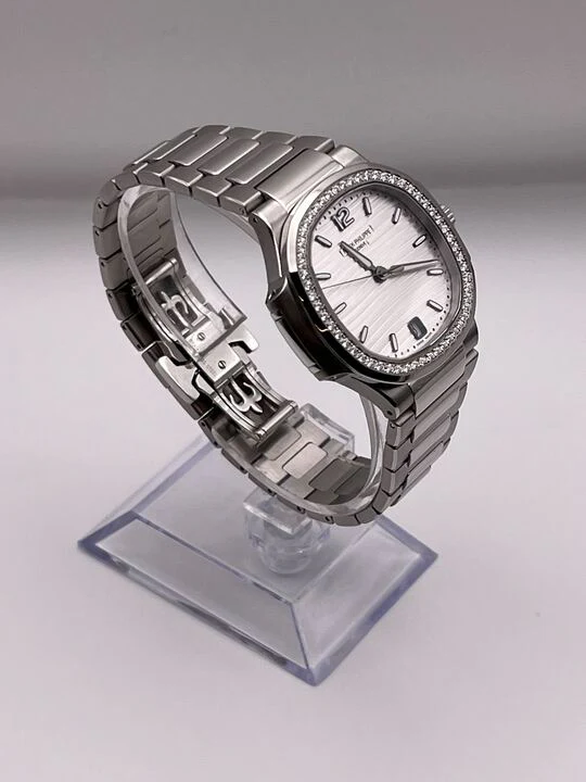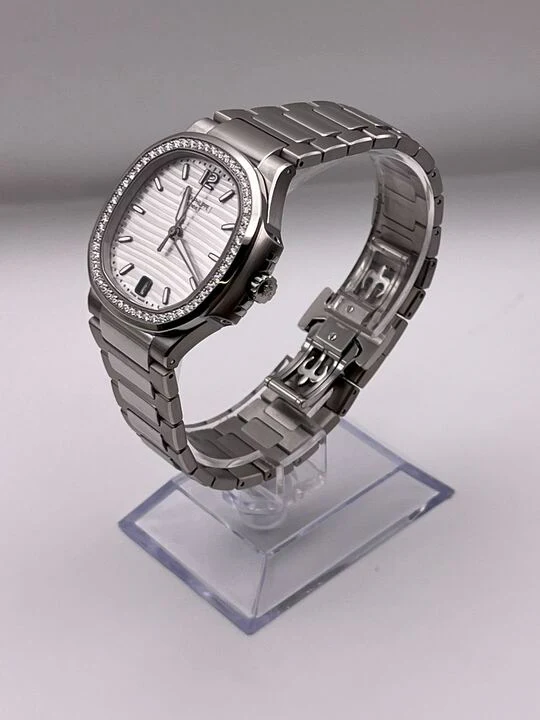 The Patek Philippe Ladies Nautilus wristwatch features a round octagonal shape diamond-set bezel and 35mm stainless steel construction. In the center, lays a silver embossed dial. It is finished with a stainless steel bracelet and fold-over clasp endowed with a new adjustment system, providing the wearer with between 2 and 4 mm of extra bracelet length for increased comfort.