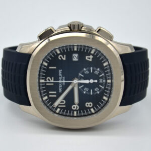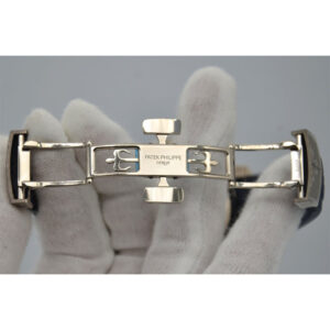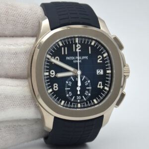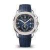 Patek Philippe is reasserting the “contemporary casual chic” spirit of the Aquanaut flyback chronograph with the first white gold version of this self-winding model, combined with an elegant midnight blue color for the dial and matching composite strap. The dial is enlivened by a black-gradient rim. Water-resistant to 120 m, the case is enhanced by polished and satin finishes. The 60-minute counter at 6 o’clock picks up the rounded octagonal shape of the bezel. The patented fold-over clasp is secured by four independent catches.
