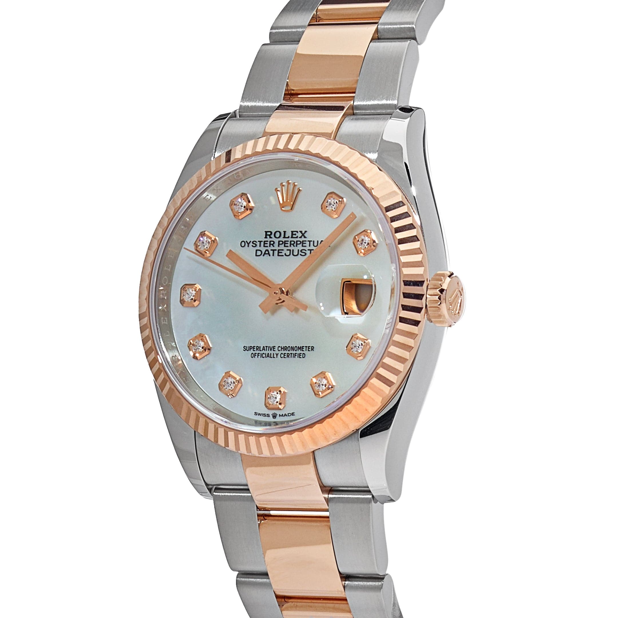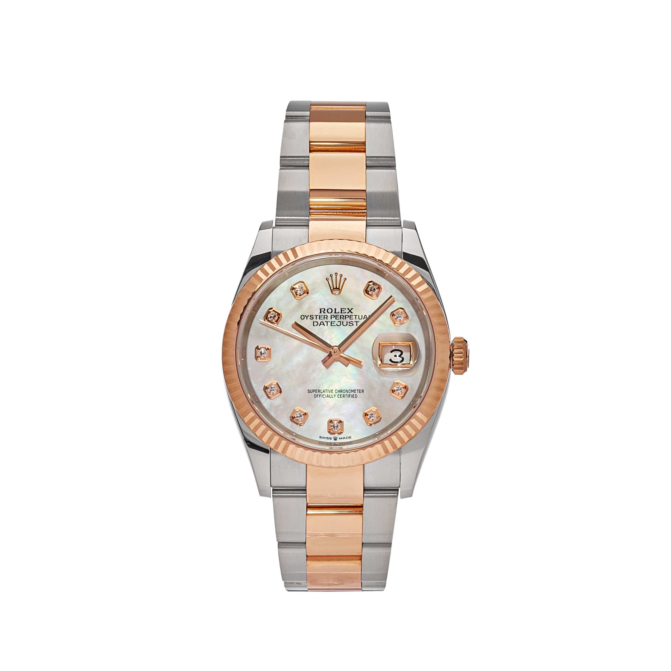 The Rolex Datejust is designed with a 36mm stainless steel and rose gold case, highlighted by the distinctive rose gold fluted bezel. It features a Mother-of-Pearl dial with diamond-set hour markers, rose gold hands and date display at 3 o’clock, protected by a scratch-resistant sapphire-crystal. The rose gold and stainless steel oyster bracelet is a true beauty.