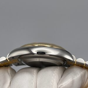 The Rolex Datejust is designed with a 36mm?stainless steel case, highlighted?by the signature 18k?yellow?gold fluted bezel. It features a champagne colored?dial with?white hour markers?and?yellow?gold hands?with a date display at 3 o’clock. It is protected by a scratch-resistant sapphire-crystal. On the wrist the 18k?yellow?gold and stainless steel jubilee?bracelet is a true beauty.?