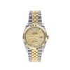 The Rolex Datejust is designed with a 36mm stainless steel case, highlighted by the signature 18k yellow gold fluted bezel. It features a champagne colored palm designed motif dial with white hour markers and yellow gold hands with a date display at 3 o’clock. The 18k yellow gold and stainless steel jubilee bracelet is a true beauty.