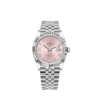 This Oyster Perpetual Datejust 36 in Oystersteel and white gold features a pink, diamond-set dial and a Jubilee bracelet.?Its dial features a Roman VI and IX in 18 ct gold, set with 24 diamonds. The light reflections on the case sides and lugs highlight the elegant profile of the 36 mm Oyster case, which is fitted with a fluted bezel. Aesthetically, the Datejust has spanned eras, while retaining the enduring codes that make it, notably in its traditional versions, one of the most recognized and recognizable of watches. It comes on a stainless steel jubilee bracelet with a steel folding clasp.
