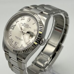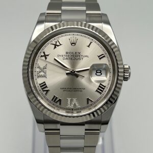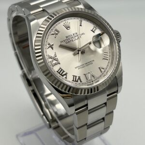 Its dial features a Roman VI and IX in 18 ct gold, set with 24 diamonds. The light reflections on the case sides and lugs highlight the elegant profile of the 36 mm Oyster case, which is fitted with a fluted bezel. Aesthetically, the Datejust has spanned eras, while retaining the enduring codes that make it, notably in its traditional versions, one of the most recognized and recognizable of watches. It comes on a stainless steel oyster bracelet with a steel folding clasp.??
