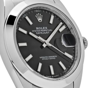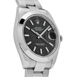 The Rolex Datejust is crafted with a 41mm stainless steel case, highlighted with a classic steel smooth bezel. The black dial is protected by scratch-resistant Sapphire crystal and hosts luminous stick hour markers and a date display at 3 o’clock. On the wrist, the stainless steel oyster bracelet is a true beauty.