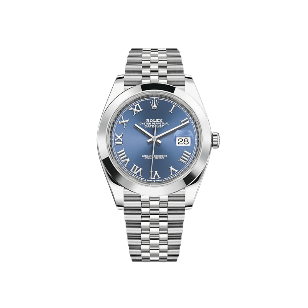 The Rolex Datejust is designed with a 41mm stainless steel case, highlighted with a classic steel smooth bezel. It features a?blue dial surrounded by luminous Roman numeral hour?markers and a date display at 3 o’clock, protected by a scratch-resistant sapphire crystal. On the wrist, the stainless steel?jubilee bracelet is a true beauty.