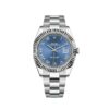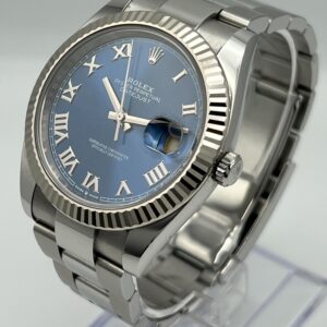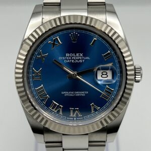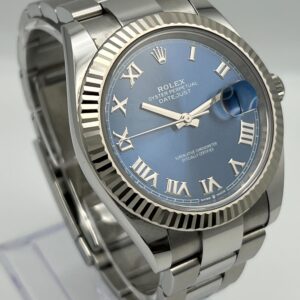 The Rolex Datejust is designed with a 41mm stainless steel case,?complemented by the signature fluted bezel, and styled on an oyster bracelet. The?bright blue dial features Roman numeral?hour markers and hands and hosts a date feature at 3 o’clock. The Rolex Datejust is a classic model and the next addition to your collection.