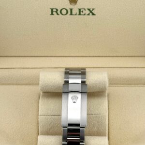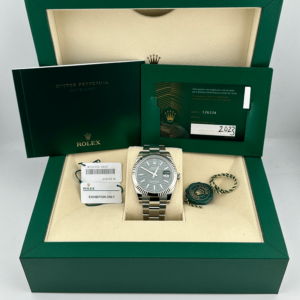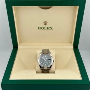 The Rolex Datejust is designed with a 41mm stainless steel case, complemented by the signature fluted bezel, and styled on a steel Oyster bracelet. The green motif dial features stick hour markers and hands and hosts a date feature at 3 o’clock. The Rolex Datejust is a classic model and the next addition to your collection.?