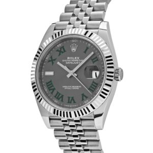 The Rolex Datejust is designed with a 41mm stainless steel case,?complemented by the signature fluted bezel, and styled on a?jubilee bracelet. The?slate dial?hosts a date feature at 3 o’clock. Roman numeral hour markers in green are representative of the famous Wimbledon court, a place where luxury and sports are perfectly paired. The Rolex Datejust 126334 is a classic model and the next addition to your collection.