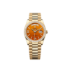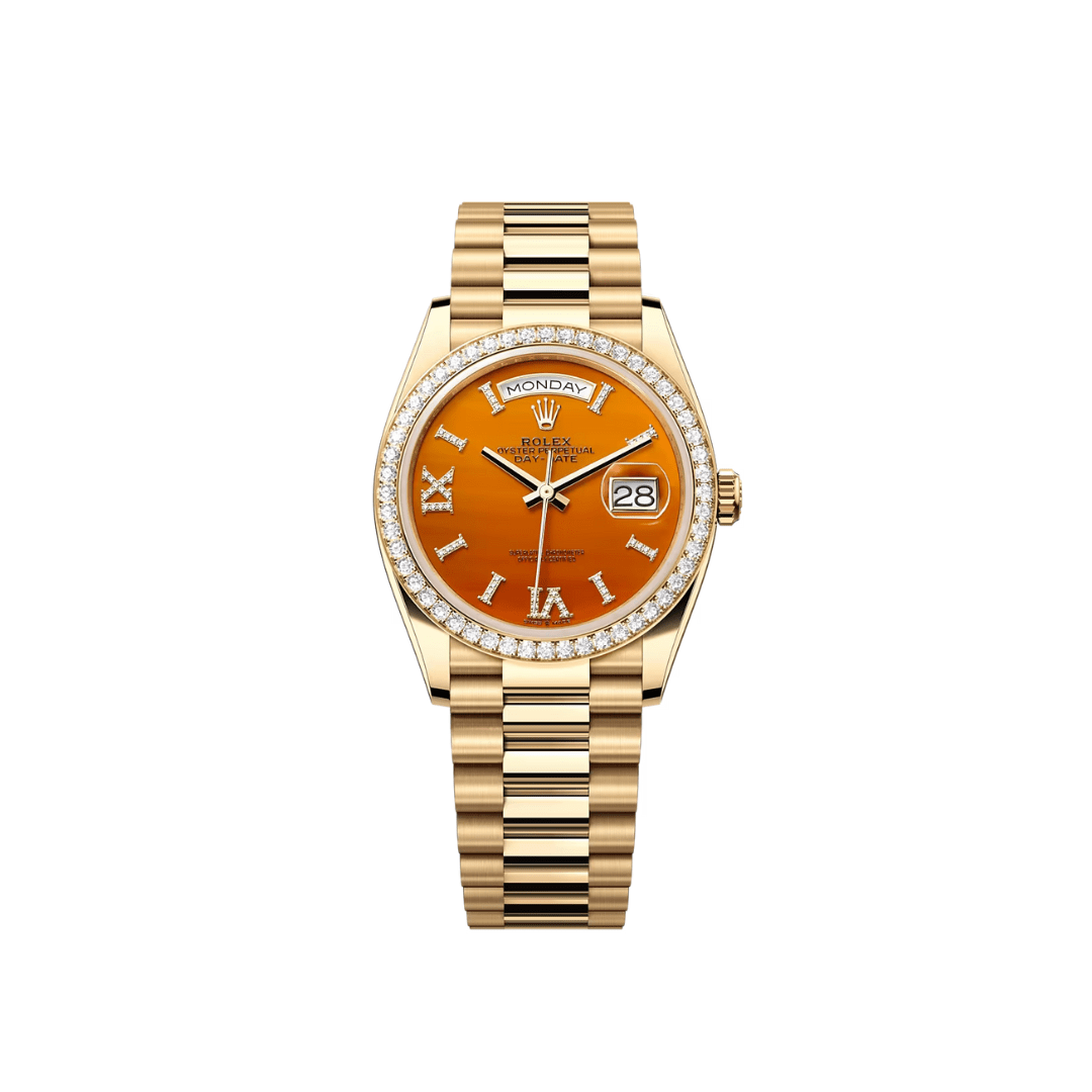 This Rolex Day-Date 36 is crafted in a yellow gold case measuring 36mm in diameter. The diamond bezel surrounds an orange dial?cut from carnelian, an orangey-colour stone typified by lines of varying shapes and sizes forming an artful cameo of patterns.?This dial features hour markers in 18 kt gold, set with 32 diamonds, and a Roman VI and IX in 18 kt gold, set with 24 diamonds. The watch comes on a yellow gold president bracelet with a concealed folding Crownclasp.