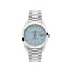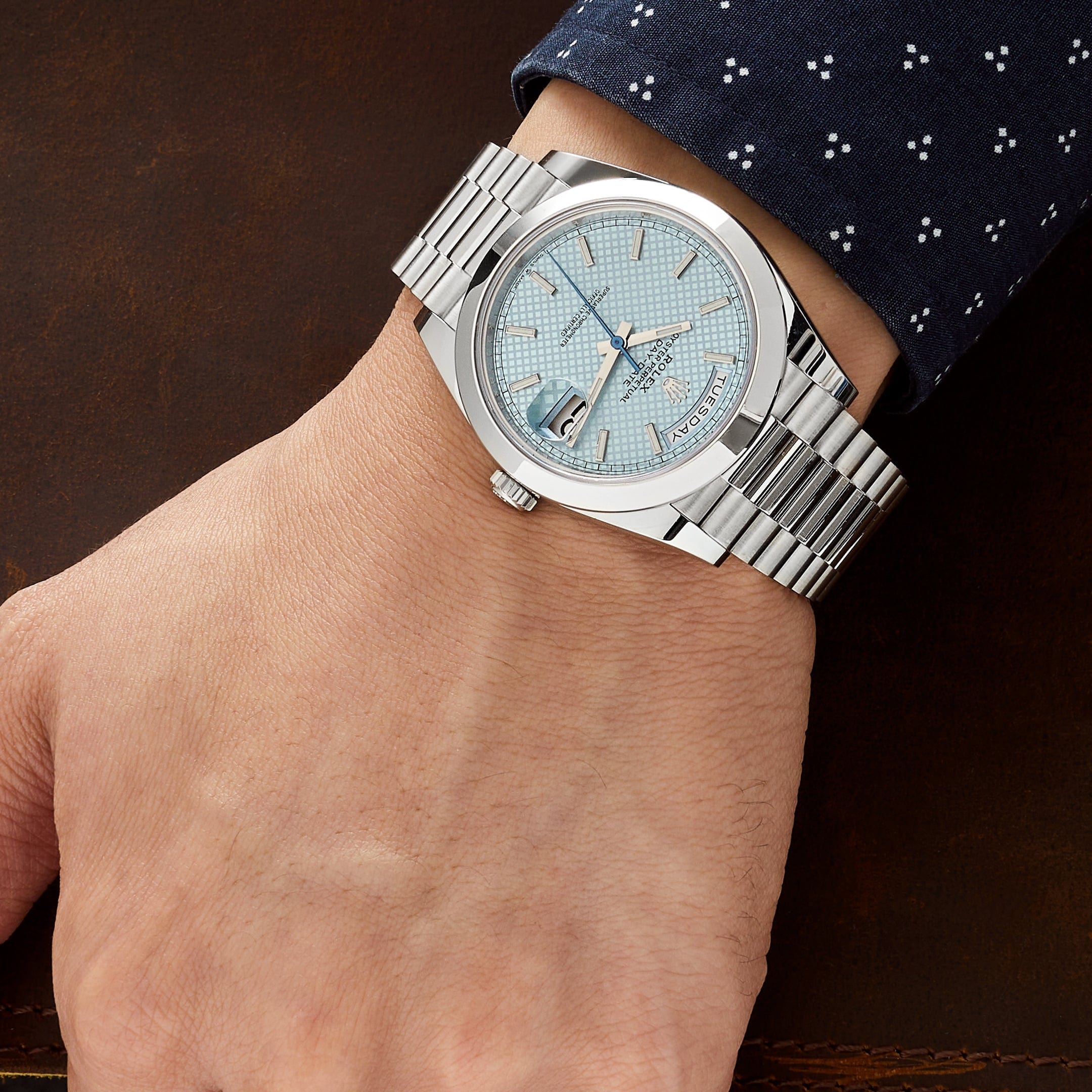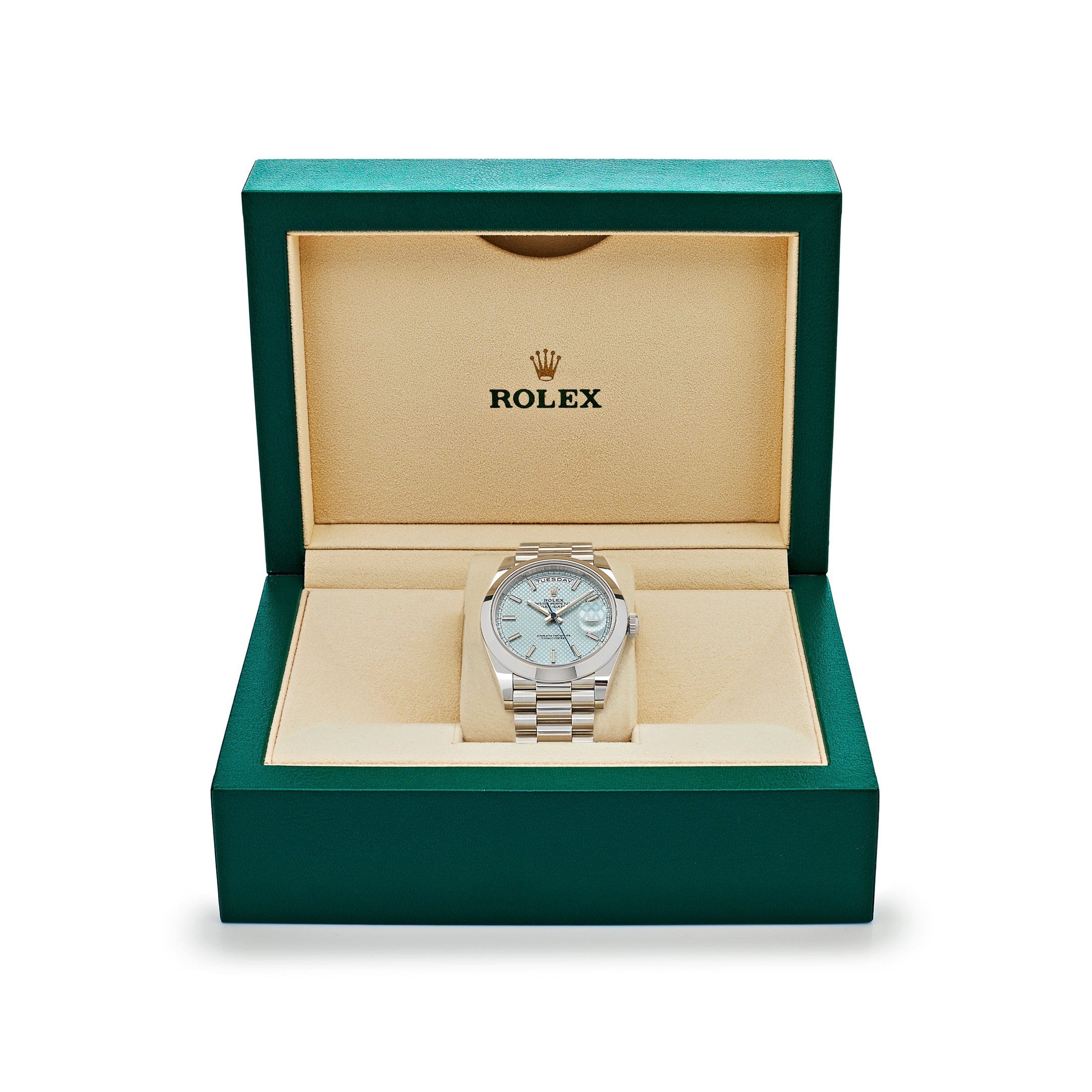 This Rolex Day-Date is crafted in a platinum case measuring 40mm. The smooth bezel surrounds an ice blue dial featuring a diagonal motif. The watch comes on a platinum president bracelet.