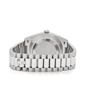 This Day-Date 40 is crafted in a 40mm platinum case with a classic fluted bezel. The ice blue dial features dark blue Arabic hour markers and hands and a date display. The watch comes on a platinum president bracelet with folding clasp.
