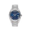 The Rolex Presidential Day-Date 40mm is inlaid in 18ct white gold and designed with a lavish blue dial, roman numeral hour markers, fluted bezel and automatic movement. The signature Presidential bracelet includes, semi-circular three-piece links and embodies excellence and charm.