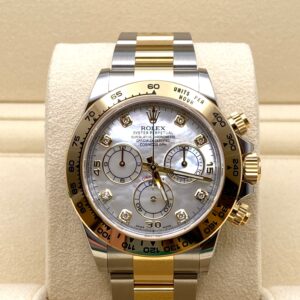 The Rolex Daytona 116503 is designed in 40mm two-toned 18k yellow gold and stainless steel with a Mother-of-Pearl?dial.?Diamond hour markers and luminous hands include a?Chromalight?display for optimal legibility. The bezel is engraved with a tachymetric scale and hosts the high-performance Chronograph. This grail can time a speed of up to 400 kilometers per hour and remains seen as the epitome of functionality meeting fashion.