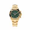 The Rolex Daytona is crafted in 18k yellow gold with a vibrant green dial. Luminous hour markers and hands include a Chromalight?display for optimal legibility. The bezel is engraved with a tachymetric scale and hosts the high-performance Chronograph. This golden grail can time a speed of up to 400 kilometers per hour and remains seen as the epitome of functionality meeting fashion.