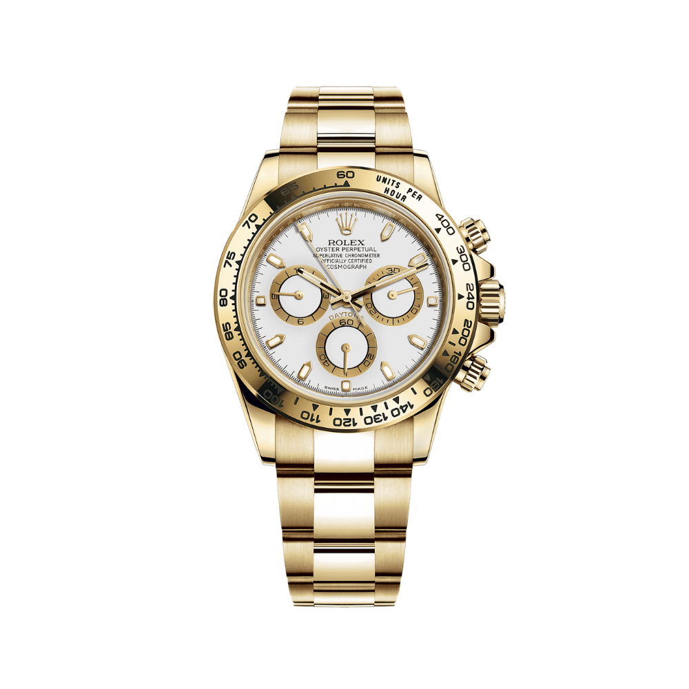 ?The Rolex Daytona 116508 is designed in 40mm 18k yellow gold with a white dial. Luminous hour markers and hands include a?Chromalight?display for optimal legibility. The bezel is engraved with a tachymetric scale and hosts the high-performance Chronograph. This watch grail can time a speed of up to 400 kilometers per hour and remains seen as the epitome of functionality meeting fashion.