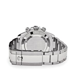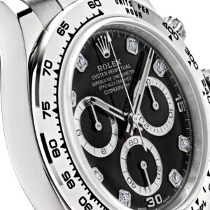 The Rolex Daytona 116509 is designed in 18k white gold with an intense black dial and complemented by diamond hour markers. Luminous hands include a Chromalight display for optimal legibility. The engraved bezel features a tachymetric scale and hosts a high-performance Chronograph with timekeeping capabilities of up to 400 kilometers per hour. With peak performance and hand-selected diamond markers, this watch is as sporty as it is sexy.?
