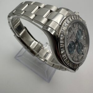 This Rolex Daytona is crafted in a 40mm Platinum case and styled on a platinum oyster bracelet. The pave diamond dial hosts 437 round diamonds, ice blue sub-dials, and highlighted by a 36 diamonds set on the bezel. Functions include tachymeter and chronograph timekeeping, marrying a lavish lifestyle with top-grade technology.?