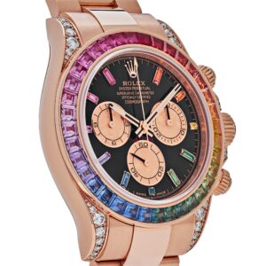 This Rolex Cosmograph Daytona staple is colorful, elegant and exudes luxury with its rainbow bezel. Designed in a 40mm 18-carat rose gold case, it features a rich black dial with snailed counters, rainbow hour markers and rose gold hands. Adding a feminine touch to this classic model, it features an ombre-effect diamond bezel with diamond accents surrounding the case, push pieces and screw-down crown. This beauty is housed on an 18ct rose gold Oyster bracelet with Oysterlock folding-clasp.