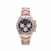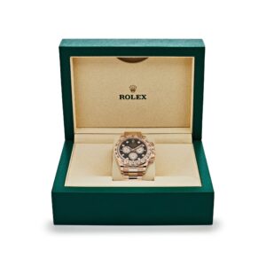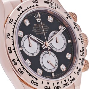 The Rolex Daytona 126505 is designed in 40mm 18k rose gold with a black dial. Diamond hour markers and luminous hands include a?Chromalight?display for optimal legibility. The bezel is engraved with a tachymetric scale and hosts the high-performance Cosmograph complication. This Daytona Cosmograph bridges the gap between form, functionality, and fashion.?