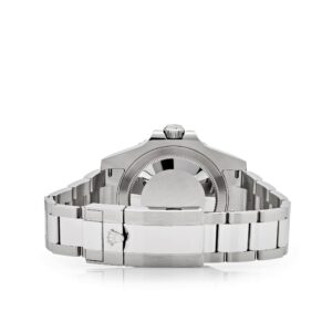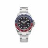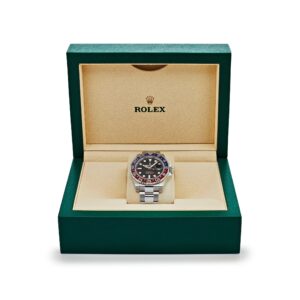 The Rolex GMT Master II?is one of Rolex’s finest creations. The case measures 40mm and is made of stainless steel, featuring a red and blue “Pepsi” design and 24hr cerachrom bidirectional bezel. It’s black dial and white luminous hour markers elevates the design, attracting a world of travelers. It is finished with a stainless steel oyster bracelet and folding clasp.?