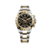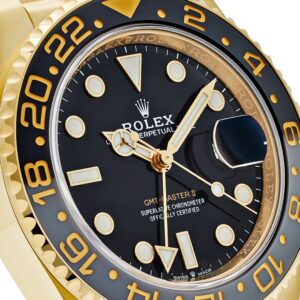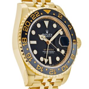 This Rolex GMT-Master II is crafted in a yellow gold?case measuring 40mm in diameter.?This model features a black dial and a two-colour Cerachrom bezel insert in grey and black ceramic. In addition to conventional hour, minute and seconds hands, the GMT-Master II features an arrow-tipped hand, which circles the dial once every 24 hours, as well as a bidirectional rotatable 24-hour graduated bezel. The watch comes on a yellow gold jubilee bracelet with a folding Oysterlock safety clasp.?