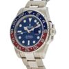 This Rolex GMT-Master II? is designed in 40mm 18k white gold and styled on an Oyster bracelet. Complications include dual time zones and 24 hour-hour display. Hour hands move independently from the minute/seconds hands, allowing the wearer to smoothly adjust to new timezones without disrupting the watch’s precise timekeeping. The eye-catching red and blue bezel coined the watch with the nickname ‘Pepsi,’ this piece also sports a matching blue bezel.?