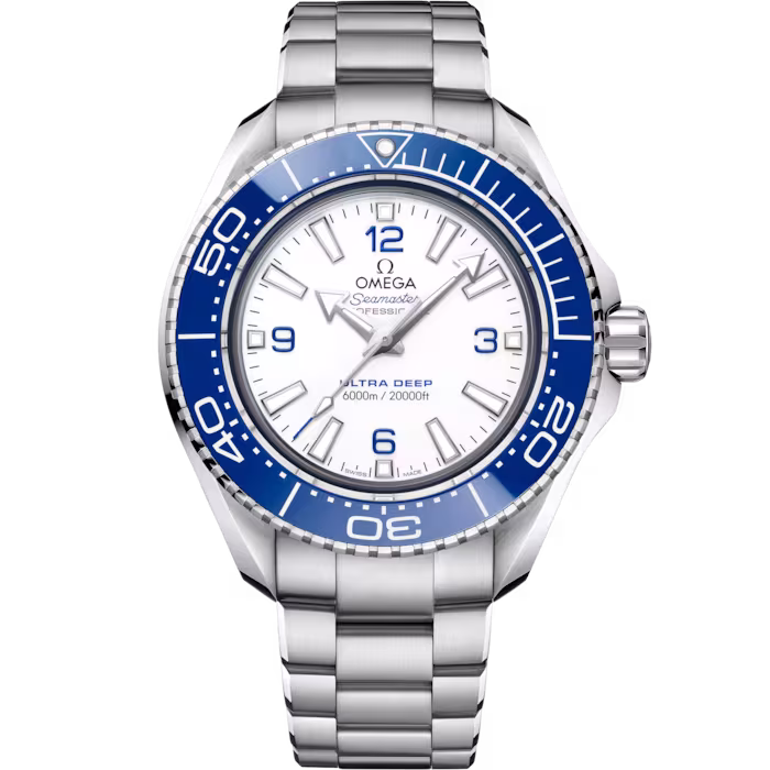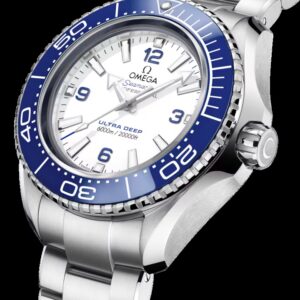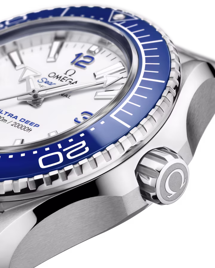 This 45.5 mm model in robust O-MEGASTEEL features a polished blue ceramic bezel with its diving scale in white enamel. Through the protuberant and domed sapphire crystal, the lacquered white dial has been given four Arabic numerals in blue, as well as 18K white gold hands and hour markers, which are all coated with white Super-LumiNova.